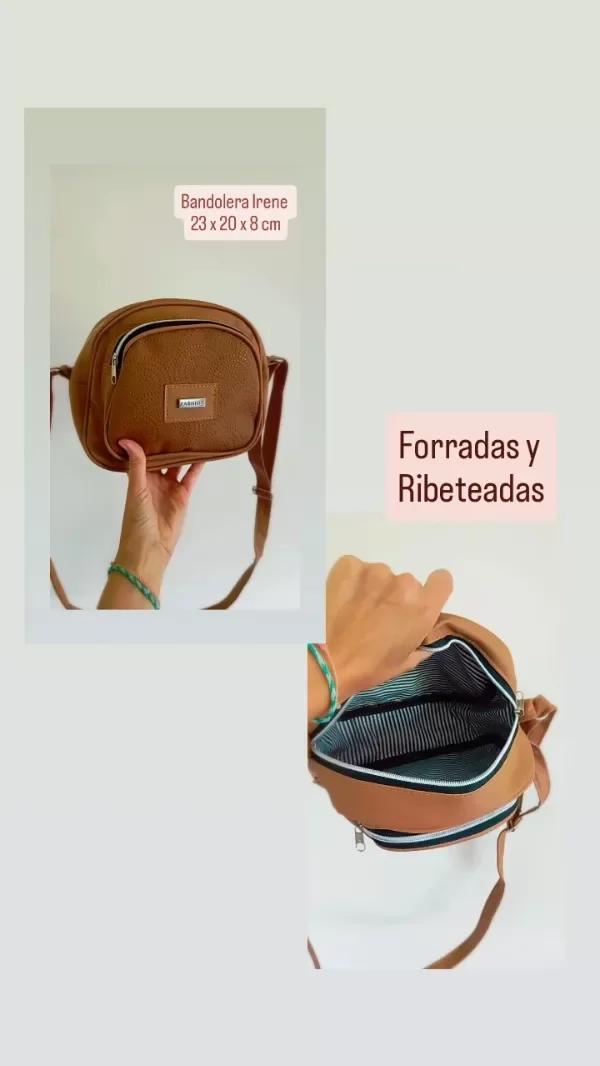 Realizada en eco cuero. Forrada y ribeteada. Correa regulable. Cierre superior y bolsillos con Cierre.