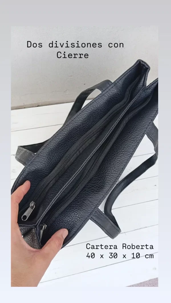 Realizada en eco cuero combinada. Dos divisiones superiores con cierre y forradas.