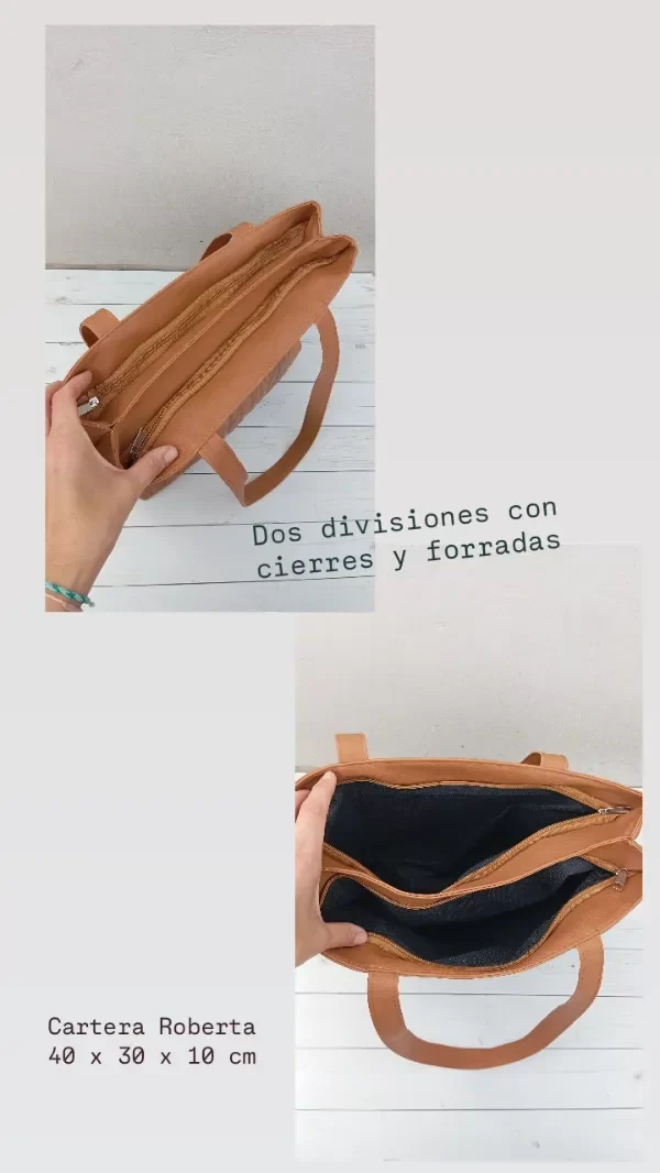 Realizada en eco cuero combinada. Dos divisiones superiores con cierre y forradas.